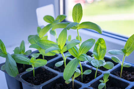 seedlings of flowers in a plastic cellular container on the windowsill
