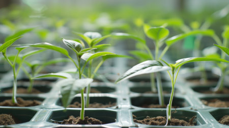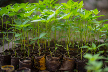 pepper seedlings growing in a greenhouse - selective focus, copy space