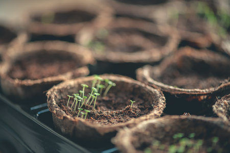green sprouts of seedlings in peat pots, on the windowsill near the window indoors. Gardening, seedlings, agriculture