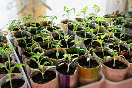 Seedlings of tomatoes and peppers in hand made paper cups from old newspapers on window, growth and development of plants, growing vegetables, eco concept, eco friendly, zero waste, gardening, sprouts