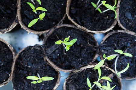 Young seedlings of tomato in peat pots on the windowsill