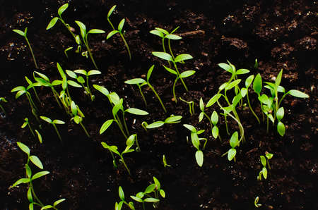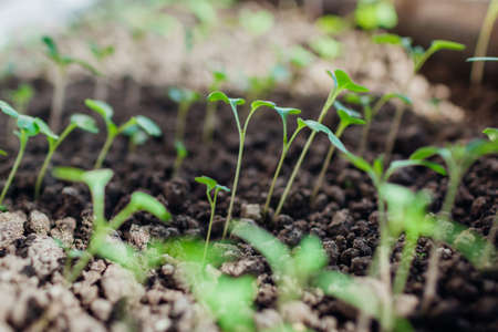 Agricultural activity, horticulture. Close-up growing sprouts cultivated in loosened black soil.