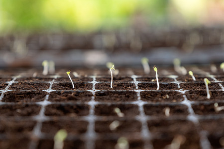 Close-up Seedlings sprout growing on soil in tray