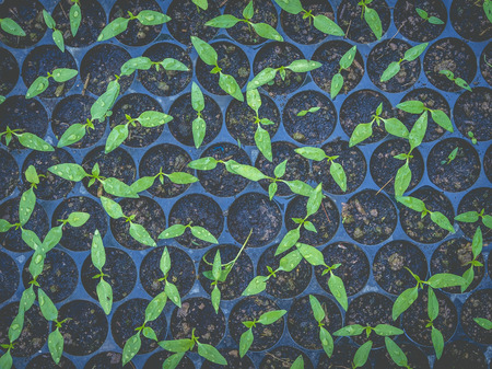 Top view of many young plant and fresh sapling in the pot, Greenery of young plant and seedling are growing, Group of grow plant and seeding in the pot.