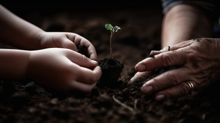 A hand gently planting a young seedling into rich, dark soil, symbolizing growth and connection to nature.
