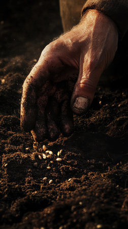 A detailed close-up of hands carefully planting seeds into dark, fertile soil, illustrating the dedication and labor involved in agriculture and gardening.
