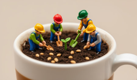 Five miniature figures are busy planting seeds in a coffee cup filled with soil. Sunlight shines on this playful scene, capturing the joy of gardening in an unusual setting.