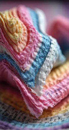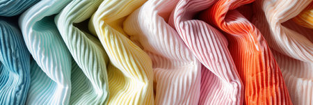 Colorful folded cloths on a light background, showcasing a variety of soft pastel hues The fabric appears cozy and inviting, ideal for home decoration or fashion concepts
