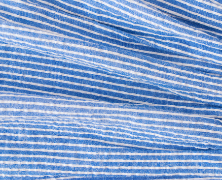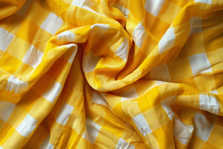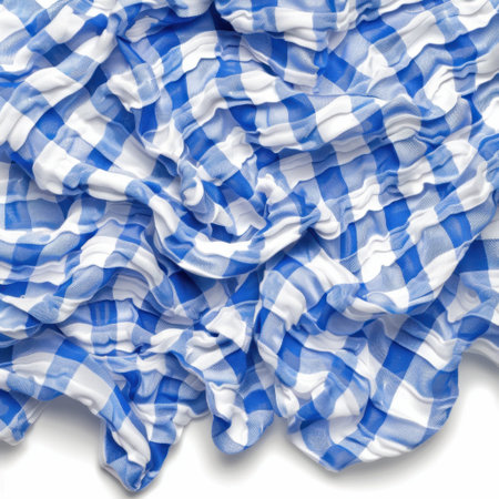 Close-up of crumpled blue and white checkered fabric with sunlight. That the image is generated using AI.