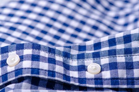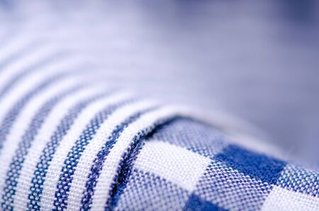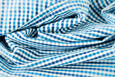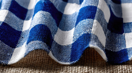 A close-up view of blue and white checkered fabric gracefully draped over a natural brown surface, highlighting its texture and design. Perfect for artistic backgrounds.