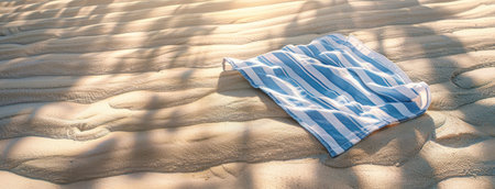 a sunny day at the beach, where a striped towel lies elegantly amidst golden sands, capturing the essence of relaxation and serenity with an aesthetic touch
