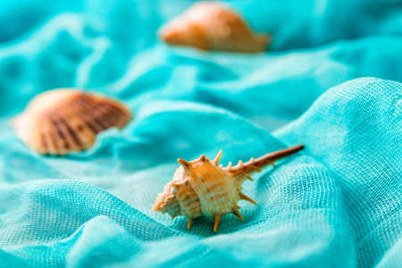 Seashell on a diffuse and colorful background Cheerful and colorful marine and vacation set