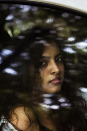 Close up portrait of a beautiful girl looking through the car window.