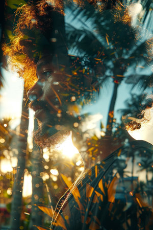 Dreamy double exposure of man s profile merging with tropical sunset for reflective ambiance