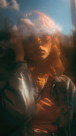 Young woman holds transparent scratched glass in front of her face reflecting sunlight. Outdoor portrait with warm natural light and creative abstract concept of identity and perception.