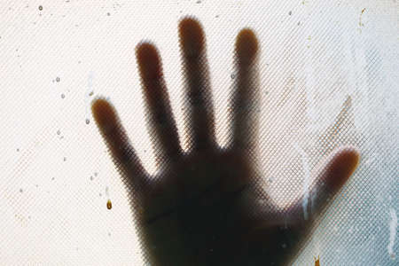 A hand behind glass in the dark, a symbol of isolation and alienation