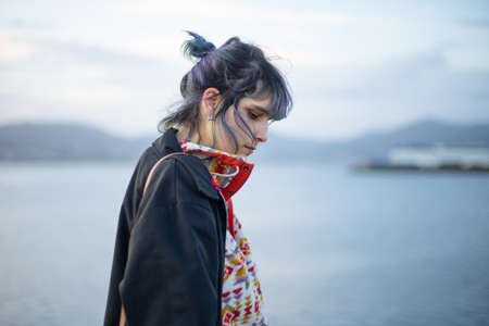 A young woman sits alone by the sea and looks at the sunset. View from the back. The concept of psychology and mental health.
