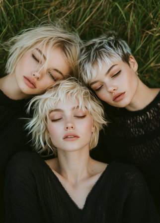 Three young women with short, stylish haircuts are lying side by side in a grassy field. They all have their eyes closed, sharing a serene moment in nature.