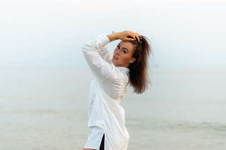 Young pretty fashion girl in white shirt. vacation at sea.Romantic Young Woman on Blue Natural Background summer Outdoors.Side view.