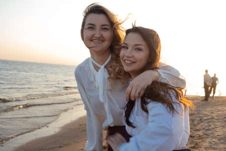 Portrait of two attractive young women with short hair looking at camera, Young lesbian couple spending time together