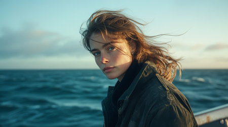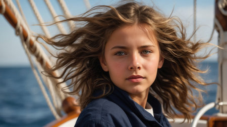 Portrait of a girl aboard a sailing ship with her hair fluttering in the wind