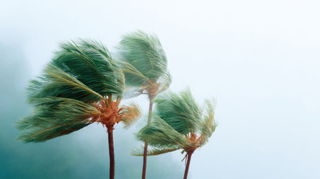 Lush palm trees sway gracefully in the wind, embodying the power of nature against a misty backdrop. This serene tropical scene creates a tranquil ambience perfect for escape.