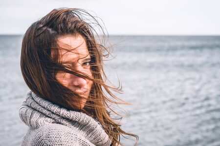 Portrait of a happy smiling woman walking outdoors in the sea shore beach on wind weather.
