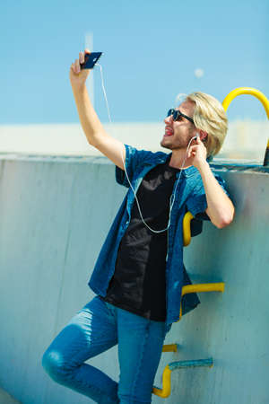 Contacts, technology, self-esteem concept. Young blonde man on vacations using his smartphone to take cool selfie shot sticking tongue out