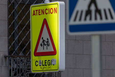 Madrid, Spain - May 18, 2020: Traffic signaling, warning of a pedestrian school zone with a zebra crossing for young children, in the Retiro district.