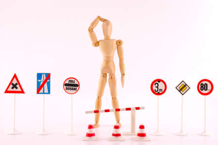 Wooden doll surrounded by signs of restriction, concept of limitation freedom