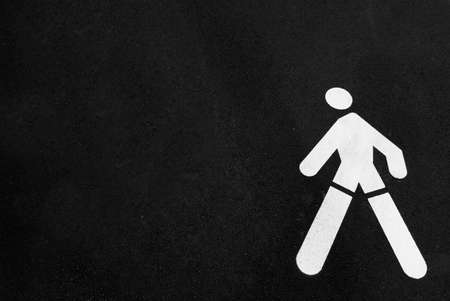 Stylized white man drawn on the black asphalt of a street to indicate the pedestrian crossing