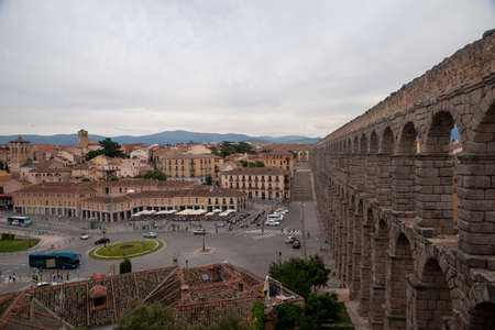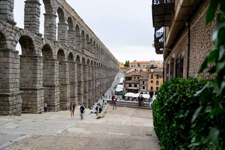 SEGOVIA SPAIN - SEPTEMBER 21, 2021. Aqueduct of Segovia. Ancient Roman aqueduct in the Plaza del Azoguejo and old construction cities in Segovia. Spain. Europe. Horizontal photography.