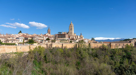 Picturesque view of Segovia, Spain, with the cathedral and snowy Guadarrama mountains in the background, showcasing a stunning skyline.