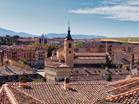 Segovia, Spain - October 04, 2019: The scenery of Segovia where the Church of San Millan is in the center surrounded by old buildings and their roofs.