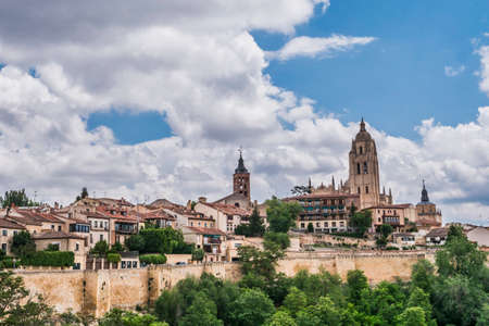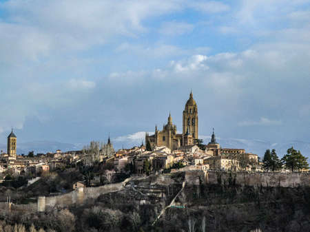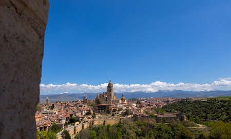 Panoramic view of the historic center of Segovia and its Cathedral from the Alcazar of that town in Spain on a sunny day
