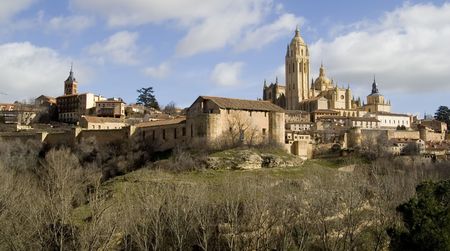 Panoramic landscape at the ancient city and cathedral of Segovia, near Madrid.