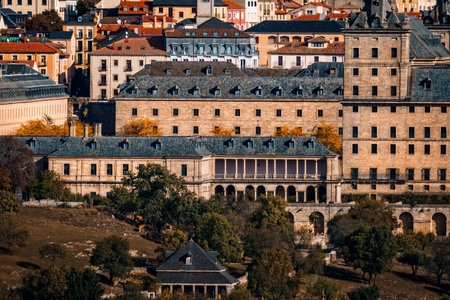 A landscape view of the Royal Monastery of San Lorenzo de El Escorial in Spain, showcasing its architectural grandeur against a backdrop of town and nature.