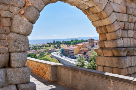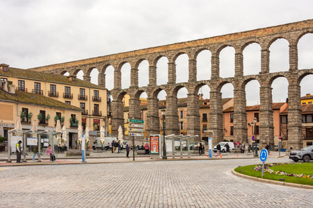 Segovia, Spain - 26 March 2025: Ancient Roman aqueduct of Segovia