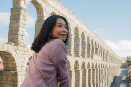 Attractive Asian girl during vacation in Spain - young happy and beautiful Korean woman visiting world aqueduct in Segovia enjoying holidays travel