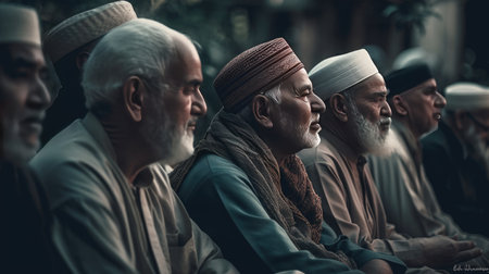 In a serene outdoor setting, a close-up captures a group of Muslim men with long beards and white skullcaps, reflecting shared moments of contemplation and community.
