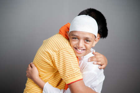 Happy Hindu Muslim Children embracing Each Other and looking camera with smile - Concept of friendship, togetherness, unity in diversity and freedom of religion