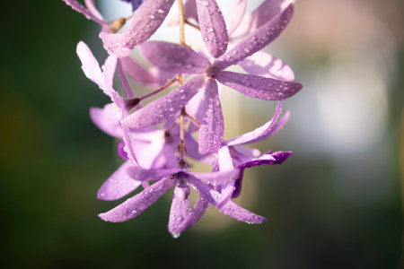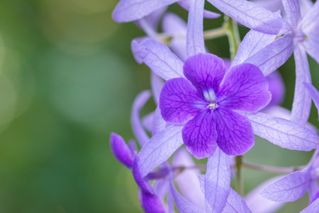 Extreme closeup selective focus of blooming purple wreath flowers or sand paper vine flowers (Scientific name is Petrea volubilis) on dark background.