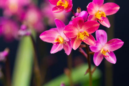 Close-up at orchids flower cluster. Stages of blooming, from unopened bud to fully opened and blooming flower. Orchidaceae.