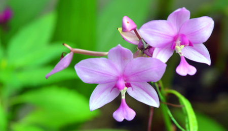 Spathoglottis violet orchids blooming and dew drops after rain ,spring nature background