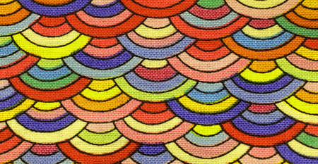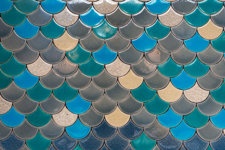 Fish scale tile pattern with vibrant colors and curved lines creates a decorative backdrop