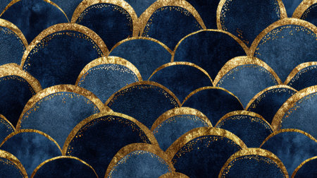 Curves with dark blue and black tones create a wave pattern. Gold highlights add sparkle to the shapes. This design can be used for various decorative purposes.
