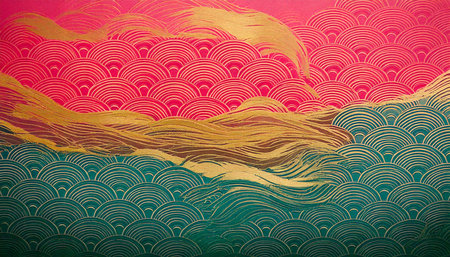 Abstract Asian landscape with gold, red, and teal waves. Generative AI