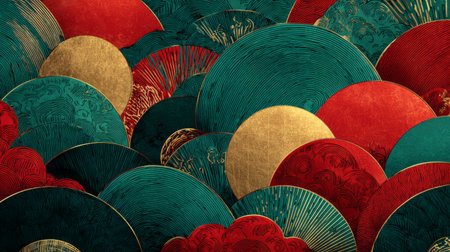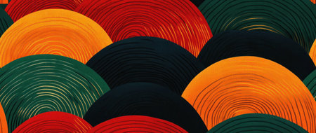 Vibrant abstract art featuring overlapping scallop shapes in red, blue, teal, and gold. textured patterns create a lively, dynamic composition. perfect for modern design projects, art prints, and colorful interior decor. Generative AI