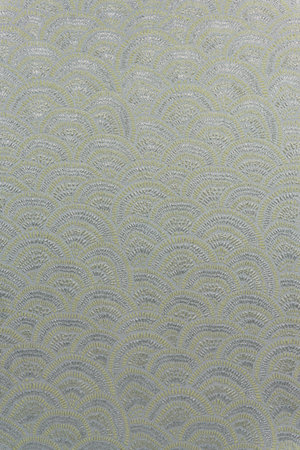 Close-up of decorative light gray-green brocade fabric featuring the motif with metallic gold and silver lurex threads, ideal for upholstery, curtains, and interior decor