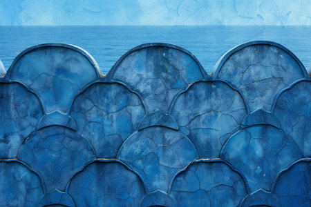 Blue wall with abstract pattern and blue sea in background. Abstract background.